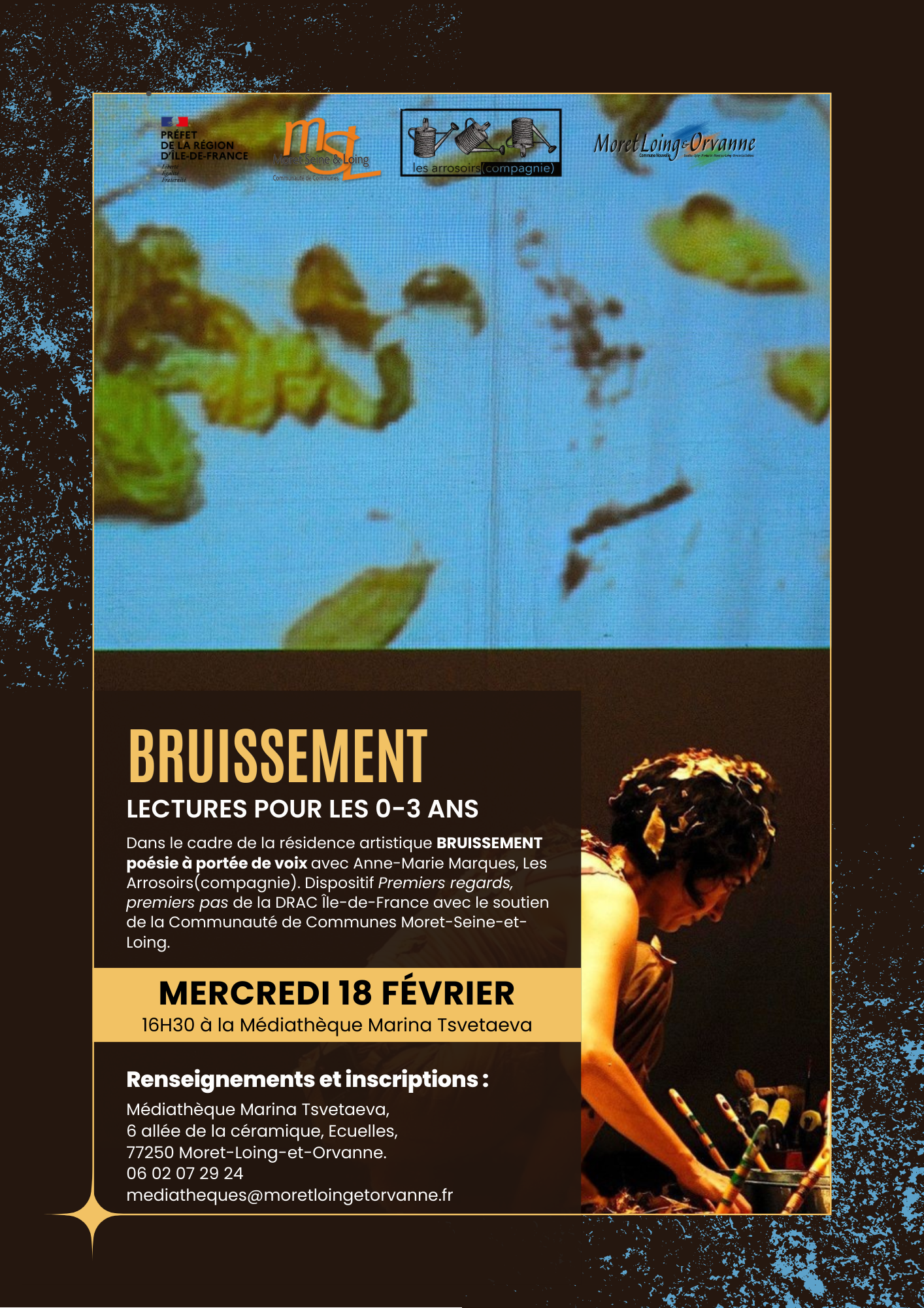 Résidence artistique BRUISSEMENT la poésie à portée de voix, avec Anne-Marie Marques, Les Arrosoirs(compagnie). Dispositif Premiers regards, premiers pas de la DRAC Ile-de-France, avec le soutien de la Communauté de communes Moret-Seine-et-Loing.